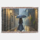 Femme de derrière, avec parapluie sous la pluie dans une vieille ruelle, la nuit avec de vieux lampadaires