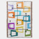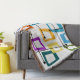 Cette couverture de lancer a un design de rectangles qui sont étirés sur une extrémité dans des couleurs super, orange, vert, turquoise, violet, bleu, rose et jaune avec des lignes atomiques qui les sillonnent.