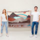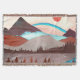 Paysage de montagne en rouge et bleu avec un lac et un arc-en-ciel bleu gras.