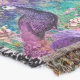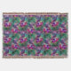 Un élégant paon coloré et un motif fleuri aux couleurs violet, vert et rose.