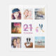 Un cadeau pour le 21ème anniversaire d'une femme, célébrant sa vie avec un collage de 8 de vos photos. Modèles pour un nom, 21 ans et une date. Date de naissance ou date d'anniversaire. Lettres de couleur rose et violet. Arrière - plan de couleur blanche.