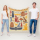 Cette couverture en toison est prête à être personnalisée avec un nom en lettres bleu clair à l'intérieur et cadre de style cartouche égyptien. Le nom accompagne un collage de graphiques inspirés de l'Egypte ancienne. Mes illustrations représentent le dieu Thoth, la déesse du chat Bastet, le scarabée sacré, le signe de vie, la reine Nefertiti, le roi Tut, Anubis et plus encore. Les illustrations sont dans les tons bleu, orange, rouge, jaune et marron sur cette couverture couleur sable.