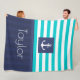 Couverture polaire marine avec motif rayé bleu turquoise et bleu marine et texte personnalisable.