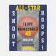 I Love Basketball est écrit en typographie noire contre le basket-ball orange au centre sur un arrière - plan cool en béton scintillant. Arrière - plan bleu marine. Saison scolaire Année écrite en blanc. All-Star, Numéro du Lecteur et Nom écrits dans la typographie couleur or jaune. Pour modifier la couleur de votre arrière - plan en couleur d'équipe, cliquez sur Personnaliser, cliquez sur Arrière - plan à gauche et sélectionnez-la dans la palette de couleurs, ou entrez un numéro de couleur de code hexadécimal. Pour modifier le nom de l'école et la mascotte correspondant à la couleur de police bleue dans la couleur de votre équipe, cliquez sur le champ de calque de texte à gauche et sélectionnez dans la palette de couleurs de texte à droite. Shoot Hoops est écrit en blanc. Texte original de basket disant Design et Photographie modèle © 2017, 2018 TamiraZDesigns.
