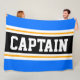 Cette conception sportive et sportive présente du texte CAPTAIN en gras à l'intérieur d'une large bande noire surlignée avec deux bandes de course blanches et jaunes contre des bandes extérieures bleu vif. Le texte peut être personnalisé.