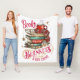 A fun and cheerful Christmas holiday design showcases a stack of books topped with a pair of glasses, a red and green scarf, and a cup of hot cocoa with whipped cream. Surrounding the books are holly leaves, candles, and stars. The colorful text reads: "Books, blankets, and hot cocoa." This design is available on a variety of products, making it a perfect gift for book lovers.