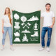 Ajoutez facilement le nom de votre terrain de camping favori et l'état dans lequel il est pour créer votre propre vêtement de camping souvenir jetez une couverture ou ajoutez un nom de famille ou un autre texte pour créer un décor personnalisé pour votre cabine de vacances avec un collage de scènes de camping et de l'équipement extérieur en blanc contre un arrière - plan vert chasseur. Fait un cadeau cool pour les campeurs et tous ceux qui aiment le grand air. Il y a des illustrations de montagnes, d'une tente, d'un feu de camp, d'une lanterne, de bottes de randonnée et plus encore.