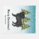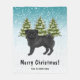L'illustration originale de Destei d'un mignon chien de race Carlin couleur manteau noir. Le chien est placé dans une scène hivernale avec trois sapins verts et la chute de neige. L'arrière - plan est un dégradé bleu à blanc qui donne un aspect froid d'hiver. Il y a aussi une zone de texte personnalisable qui se lit maintenant "Joyeux Noël !". Il y a une autre zone de texte personnalisable pour un nom de famille ou un autre texte personnalisé.