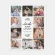 Cette couverture en toison de photos de famille fait un cadeau parfait pour le gardien. Le design offre un montage photo de 10 avec le texte "Cherish Every Moment". Personnalisez chaque cadre photo carré avec vos photos de famille préférées. Le design est composé d'un texte de style manuscrit moderne, d'une branche de palmier verte et d'un arrière - plan blanc.