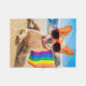 Cette jolie photo montre un chihuahua chien sur la plage portant un drapeau Gay pride couleur arc-en-ciel.