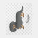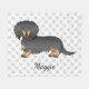 Illustration originale de Destei d'un chien de race Dachshund aux cheveux longs mignons, noir et tan. L'arrière - plan a un motif d'empreintes de pattes de chien gris. Il y a aussi une zone de texte personnalisable pour un nom.