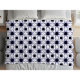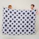 Towels and a washcloth feature a geometric pattern with navy blue stars and circles on a white background, providing a modern and sophisticated look.
