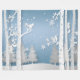 Décor de découpe de papier frappant en bleu et blanc avec des arbres, des écureuils et des flocons de neige.