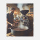 Un gros plan des mains dans un tablier usé en ajoutant soigneusement un bouquet de fèves de café brun riches dans une machine vintage torréfaction du café. La vapeur ou la fumée s'élève gracieusement de la machine, en faisant allusion au processus de torréfaction aromatique à l'intérieur. Le décor industriel et accueillant est orné d'un mur en briques rustiques et d'un éclairage chaleureux, qui rappelle un café ou un rôtisseur confortable. Des étagères remplies d'objets en rapport avec le café ajoutent à l'ambiance de café authentique.