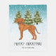 Illustration originale de Destei d'un mignon chien de race hongroise Vizsla. Le chien est placé dans une scène hivernale avec trois sapins verts et la chute de neige. L'arrière - plan est un dégradé bleu à blanc qui donne un aspect froid d'hiver. Il y a aussi une zone de texte personnalisable qui se lit maintenant "Joyeux Noël !". Il y a une autre zone de texte personnalisable pour un nom de famille ou un autre texte personnalisé.