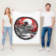 Illustration d'un jardin japonais avec arbres, étang, rochers et une pagode aux couleurs rouge, blanc et noir entouré d'un cercle noir grunge
