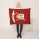 Jetez une couverture avec l'illustration d'un mignon garçon caucasien souriant avec de courts cheveux noirs, le garçon porte un costume de Père Noël avec un casquette rouge et tenant un cadeau ; dans un cercle rouge sur un arrière - plan rouge, un dessin de Noël avec un modèle texte modifiable pour votre nom ou message