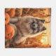 Profitez du charme rustique de l'automne avec notre superbe couverture présentant un Keeshond dans un champ de moisson alors que le soleil se couche dans l'arrière - plan.