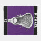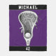 Couverture cadeau en crosse personnalisée avec design bâton et balle sur arrière - plan violet. Modifiez le texte pour ajouter le nom du joueur laxiste et le numéro d'équipe.