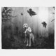 Photo fantastique de deux loups blancs dans une forêt enchanteresse. Une photographie unique montre des feuilles flottant sur le terrain de la brume où les animaux magnifiques se tiennent comme un.