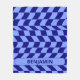 Couverture en toison personnalisée avec motif ondulé déformé à damiers nom personnalisé en bleu marine et bleu clair.