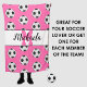 Ce design rose présente un arrière - plan motif de football, ainsi qu'un monogramme rose et noir et un design typographique de nom qui peut être customisé à votre athlète.