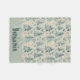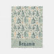 Couverture avec motif de Noël dans les tons vert mousse, avec neige, arbres de Noël et ornements, avec un rectangle vert mousse au fond et le nom de la personne qui recevra la couverture dans une typographie spéciale pour la saison