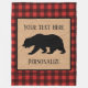 Au centre se trouve la silhouette d'un ours noir avec des modèles de texte au-dessus et au-dessous en lettres noires pour vous permettre de personnaliser cette image et ce texte à l'intérieur d'un carré de burlap avec une bordure noire. Le motif arrière - plan est un bison rouge et noir plaid de bison.