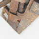 Une collection d'anciens outils à manches rouges anciens sur une table à un marché aux puces.