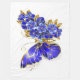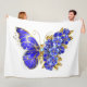 Bijoux, bleu, saphir, papillon aux fleurs pétillantes avec aile décorée de bleu, fleurs précieuses avec feuilles d'or sur arrière - plan blanc.