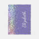 Mignonne couverture en toison violette de fille brillant avec confettis en faux arc-en-ciel de parties scintillant. Personnalisez avec son nom dans un script blanc.