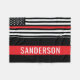 Cette conception comprend un drapeau de pompier avec des rayures noires et blanches, une mince bande rouge ainsi que la capacité de customiser avec le nom du destinataire. Un grand accessoire pour les héros en première ligne, ou montrer votre soutien au pompier, à la femme, au capitaine ou au chef de votre vie.