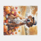 Un tableau aquarelle d'un chien gai assis au milieu d'un tas de feuilles d'automne vibrantes, entouré de minuscules citrouilles et de glands épars. Le chien porte un petit casquette pèlerin et des poutres de joie, capturant l'esprit de Thanksgiving. Dans l'arrière - plan, les champs de moissons et les arbres dorés créent une ambiance campagnarde paisible. Des textures douces et des tons d'automne chauds et feutrés confèrent à la scène une atmosphère cosy et nostalgique parfaite pour célébrer la beauté de la saison.