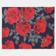 Motif frappant de roses rouges vibrantes avec feuilles gris et branches dressées contre un arrière - plan bleu marine profond. Les roses sont représentés à différents stades de floraison, des bourgeons serrés aux fleurs entièrement ouvertes, créant un sentiment de profondeur et de mouvement.