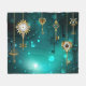 Or, clés antiques avec engrenages et cadrans accrochés sur chaînes dorées sur arrière - plan vert lumineux.