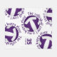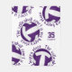 Cette couverture en toison à thème volleyball sportif comporte 5 volleyball violet et blanc arrangés au hasard avec le texte "Le terrain de volleyball est mon endroit heureux" en violet encerclant chaque volleyball dans une police typographique amusante, le tout sur un arrière - plan blanc - son nom et son numéro de maillot sont personnalisables - par katz_d_zynes