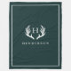 Couverture unique d'ouatine avec un contexte de pin et une tache pour votre nom ou monogramme de famille entre un ensemble d'andouillers de cerfs communs. Sous les andouillers est une tache facultative pour mettre votre nom ou nom de famille de famille.