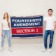 Quatorzième amendement Section 3. L'article 3 du 14e amendement stipule que "Nul ne peut être sénateur ou représentant au Congrès, ou électeur du président et du vice-président, ou occuper une fonction, civile ou militaire, aux États-Unis, ou sous un État, qui, ayant prêté serment, en tant que membre du Congrès, ou en tant que fonctionnaire des États-Unis, ou en tant que membre d'une législature d'État, ou en tant qu'exécutif ou huissier de tout État, pour appuyer la Constitution les États-Unis, ont commis une insurrection ou une rébellion contre la même, ou ont donné de l'aide ou du réconfort à leurs ennemis. Mais le Congrès peut, par un vote des deux tiers de chaque Chambre, supprimer ce handicap." Rappelez aux gens lors de votre prochain rassemblement politique extérieur, ou lorsque vous êtes assis à un stand partisan et que vous fournissez des informations lors d'un événement d'extérieur froid en automne, que les responsables de l'insurrection, en particulier son cheville, doivent être tenus pour responsables et sont exclus de la fonction publique en raison du quatorzième amendement à la Constitution des États-Unis. Description du design : Sur tout l'espace, un arrière - plan bleu. Au-dessus de la moitié supérieure, les mots "Quatorzième amendement". Au-dessus de la moitié inférieure, une large bande en rouge patriotique, bordée sur le dessus et le bas en blanc, et au centre de cette bande, les mots "Section 3" dans une police serif blanche entièrement casquette.