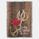 Personnalisez la charmante Mariage de l'Ouest du pays des Roses rouges et des Chevaliers Bits avec les noms de la mariée et du mariée et leur date de la cérémonie de mariage à thème de la ferme rurale ou du ranch occidental pour créer un cadeau de conservation pour une fête de fiançailles, une douche de mariée ou un mariage. Cette couverture nuptiale à thème équestre chic et rustique présente une photo florale pittoresque de trois fleurs de roses rouges, un collier de perles blanches et un morceau de cheval avec un arrière - plan de grange brun patiné.
