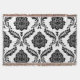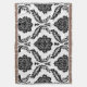A vintage style decorative damask surface pattern influenced by rococo classical design in black detail on a white background.