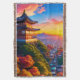 Un temple japonais situé sur une colline, qui offre une vue pittoresque sur la ville et les montagnes au coucher du soleil.