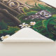 Un homme vert avec un mignon ami de hibou assis sur une branche. Un noeud celtique travaille en pierre derrière eux.