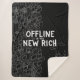 Un amas dense de bâtiments géométriques se trouve à côté de l'expression "Hors ligne est le Nouveau Richesse", qui met en évidence le contraste entre la vie urbaine et en ligne, et la simplicité. A droite, une petite maison est entourée d'arbres et de nuages.