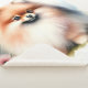 Un chien poméranien moelleux avec un manteau orange et blanc vibrant, avec de grands yeux expressifs et une expression joyeuse. Il se dresse au milieu de fleurs douces et pastel et de douces éclaboussures d'aquarelle, créant une atmosphère chaleureuse et accueillante. L'arrière - plan est léger et aéré, rehaussant la fourrure moelleuse du chien et son comportement ludique.