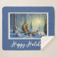 Fun Holiday Sherpa couverture caractéristiques fantaisie et surréaliste de la forêt de Noël avec des arbres enneigés, créé avec un logiciel générateur d'IA. Le texte "Happy Holidays" sur arrière - plan bleu est personnalisable.