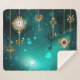 Or, clés antiques avec engrenages et cadrans accrochés sur chaînes dorées sur arrière - plan vert lumineux.