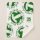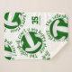 Cette couverture en polaire sherpa de volleyball sporty propose 5 volleyballs verts et blancs disposés aléatoirement avec le texte "Le terrain de volleyball est mon endroit heureux" en vert encerclant chaque volleyball dans une police typographique amusante, le tout sur un arrière - plan blanc - son nom et son numéro de maillot sont personnalisables - par katz_d_zynes