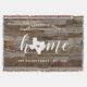 Montrez un peu de fierté de l'état de la maison avec cette mignonne couverture en faux bois rustique jetant "maison" en écriture calligraphique blanche avec une carte silhouette de l'état du Texas debout pour la lettre "O." Une illustration de coeur rose à l'intérieur de la carte d'état complète la conception; vous pouvez changer la position du coeur à votre ville d'origine en ouvrant l'outil de conception et en faisant glisser la forme du coeur à votre endroit préféré. Personnalisez avec votre ville natale, votre nom de famille et votre année établie pour créer un cadeau parfait et mémorable de ménage ou d'ajout à votre nouvelle maison.