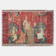 Tapisserie ancienne tissée à Bruxelles vers 1500. Princesse faisant de la musique dans le jardin fleuri avec une licorne, lion et autres animaux, élaboration numérique et design par Bulgan Lumini