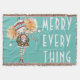 Femme aux cheveux de gingembre capricieux décorée en tenue hivernale colorée mignonne avec texte "Joyeux Tout" empilé blanc sur arrière - plan d'aqua.